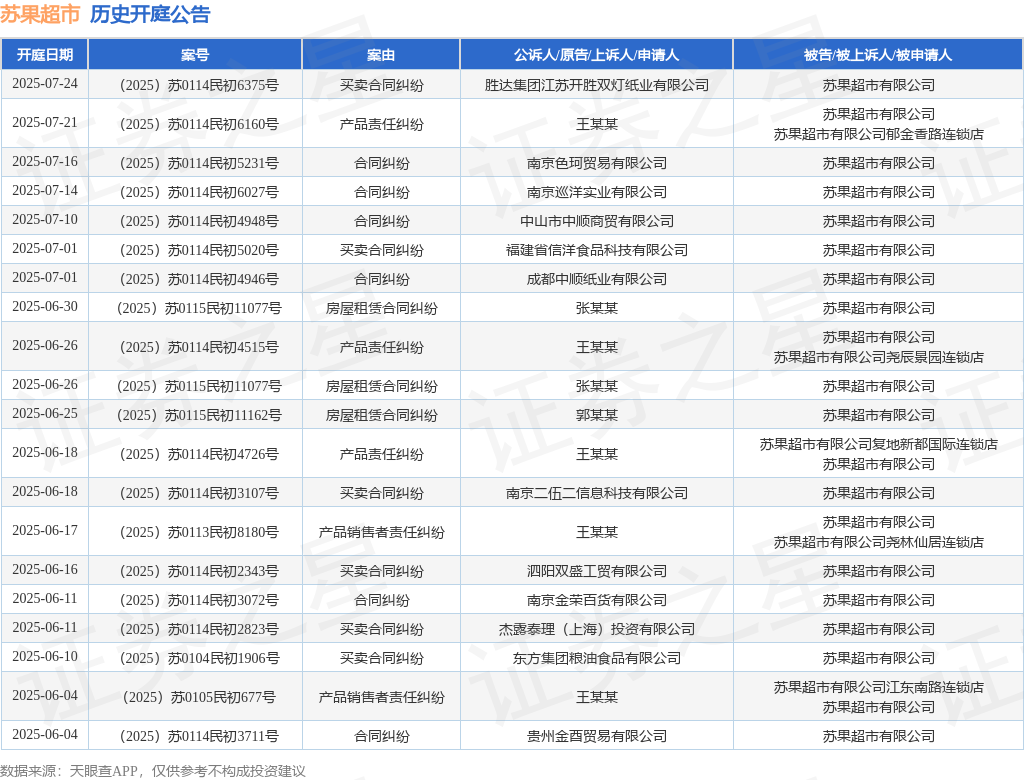 案号:(2025)苏0113民初8180号审理法院:南京市栖霞区人民法院案由:产品销售者责任纠纷当事人信息: 原告/上诉人:王某某 被告/被上诉人:苏果超市有限公司、苏果超市有限公司尧林仙居连锁店开庭日期:2025年6月17日根据统计,近一年内以苏果超市有限公司为当事人的历史开庭公告有178则,其中案由为“买卖合同纠纷”的公告以75则居首,其次为“合同纠纷”有25则,“产品责任纠纷”有19则。历史开庭公告(前20条)如下: