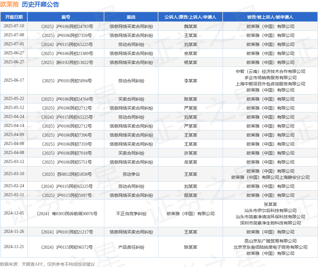 案号:(2025)沪0101民初5094号审理法院:上海市黄浦区人民法院案由:劳动合同纠纷当事人信息: 原告/上诉人:李某某 被告/被上诉人:中智(云南)经济技术合作有限公司、多企市场销售服务有限公司、上海中智项目外包咨询服务有限公司、欧莱雅(中国)有限公司开庭日期:2025年6月17日根据统计,近一年内以欧莱雅(中国)有限公司为当事人的历史开庭公告有28则,其中案由为“信息网络买卖合同纠纷”的公告以13则居首,其次为“劳动合同纠纷”有6则,“劳动争议”有3则。历史开庭公告(前20条)如下: